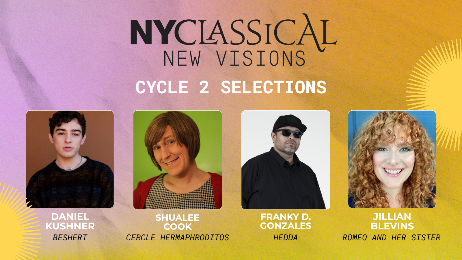 New York, NY â New York Classical Theatre has announced the four selections for Cycle 2 of New Visions, its play development program supporting new works inspired by classical texts. Selected from nearly 400 submissions from across the United States, these plays will move forward in a multi-phase development process culminating in public readings and continued artistic development.